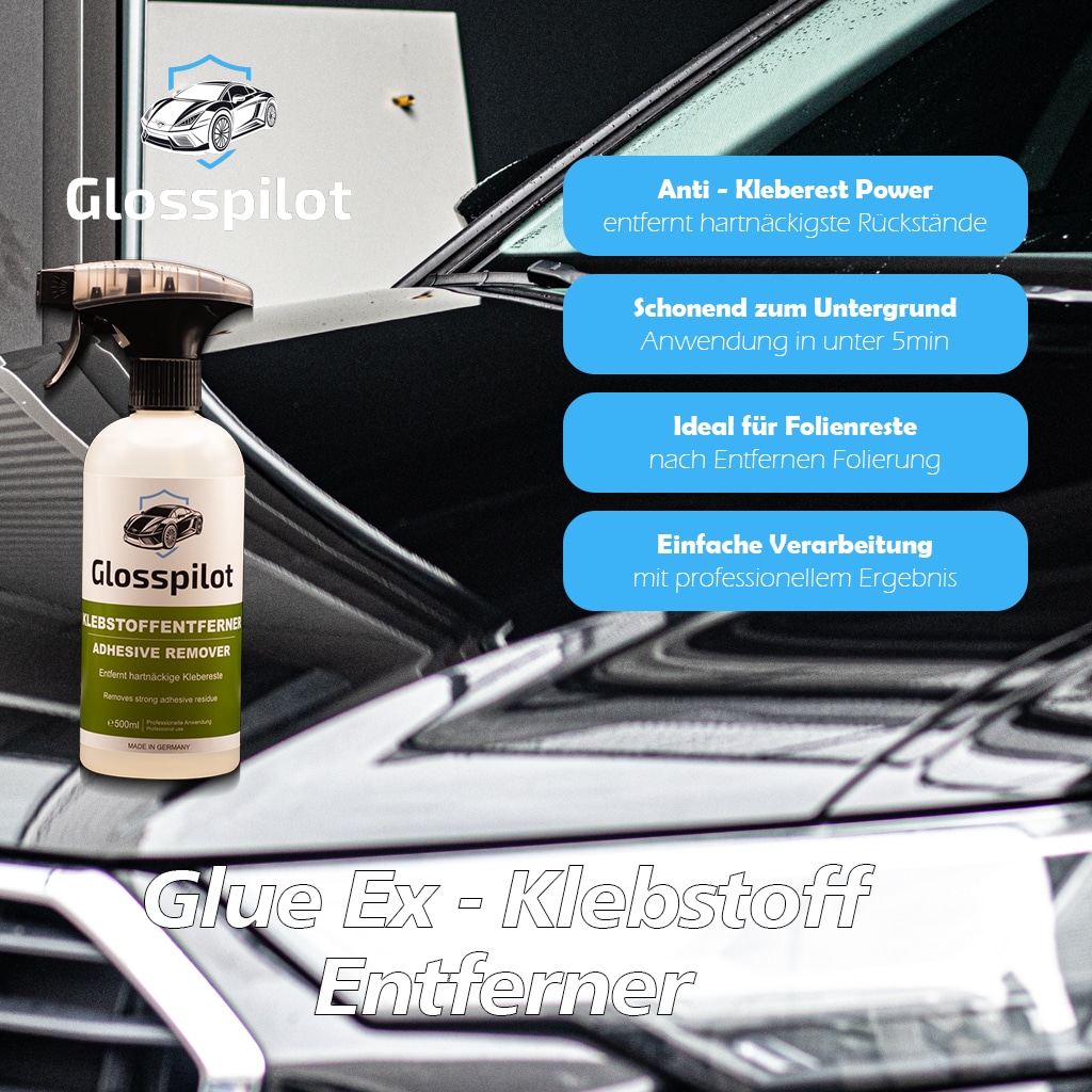 Glosspilot Klebstoffentferner ist ein hochwirksamer Spezialreiniger zur zuverlässigen Entfernung von Klebstoffresten, Aufklebern, Folienrückständen und Harzverschmutzungen.