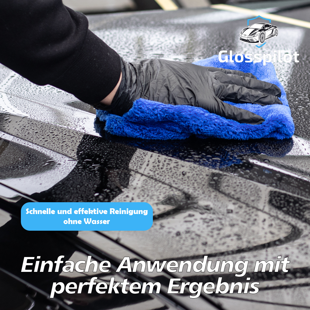 Fahrzeugoberfläche leicht mit Glosspilot Schnellwachs besprühen, mit einem sauberen Mikrofasertuch gleichmäßig verteilen und anschließend mit einem zweiten Tuch auf Hochglanz auspolieren.