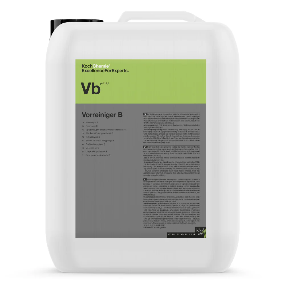 Der Koch Chemie – Vorreiniger B ist ein hochkonzentrierter, phosphatfreier und schaumstarker Alkalreiniger für die professionelle Vorwäsche. Seine effektive Formel entfernt selbst hartnäckige Verschmutzungen wie Insektenreste, Vogelkot, Bremsstaub und Umweltablagerungen mühelos – ideal für stark frequentierte Waschanlagen und die kontaktlose Hochdruckreinigung.