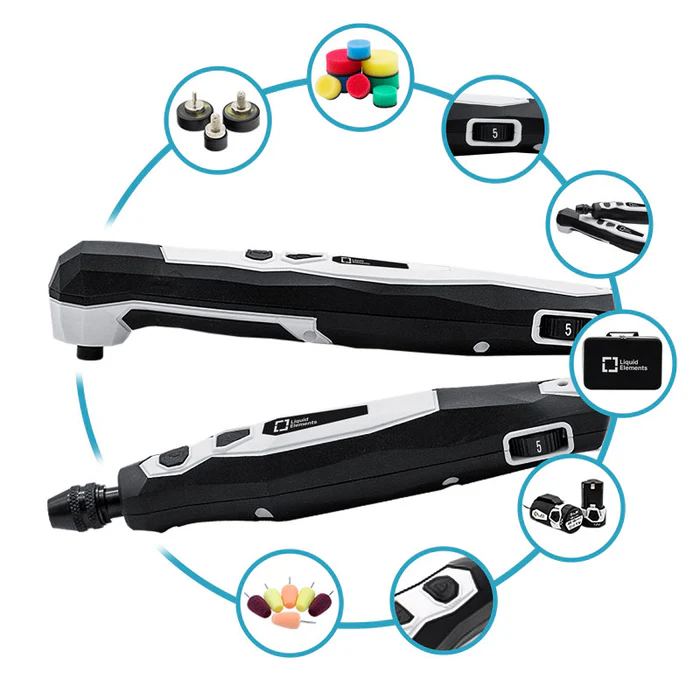 DieMini Akku Poliermaschine KIT A800 verfügt über einen geraden Polierkopf, in den problemloses Polierkegel mittels Spannzange eingespannt werden können. So können Bereiche wie Türmulden, Lüftungsgitter und weitere Engstellen problemlos poliert werden.