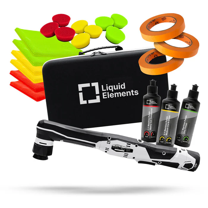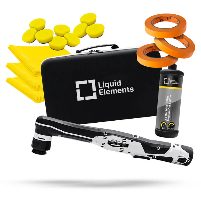 Das Liquid Elements A1000 Poliermaschinen-Set bietet alles für professionelle Autopflege: leistungsstarke Mini-Akku-Poliermaschine, Polituren, Pads, Mikrofasertücher & Masking Tape. Komplettlösung für flexibles, effizientes und perfektes Lackfinish.