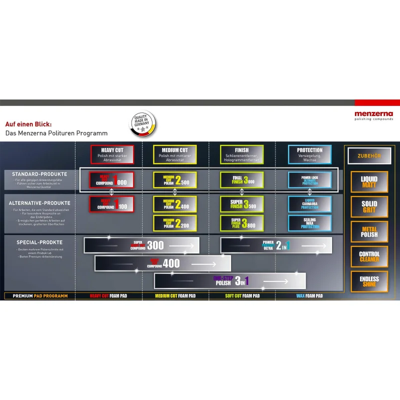 Die Menzerna Medium Cut Polish 2500 – 250 ml (MCP 2500) in der handlichen 250 ml-Größe ist eine mittelabrasive Politur, die speziell entwickelt wurde, um Kratzer, Schleifspuren und Gebrauchsspuren effizient zu beseitigen – während sie zugleich einen beeindruckenden Tiefenglanz erzeugt.