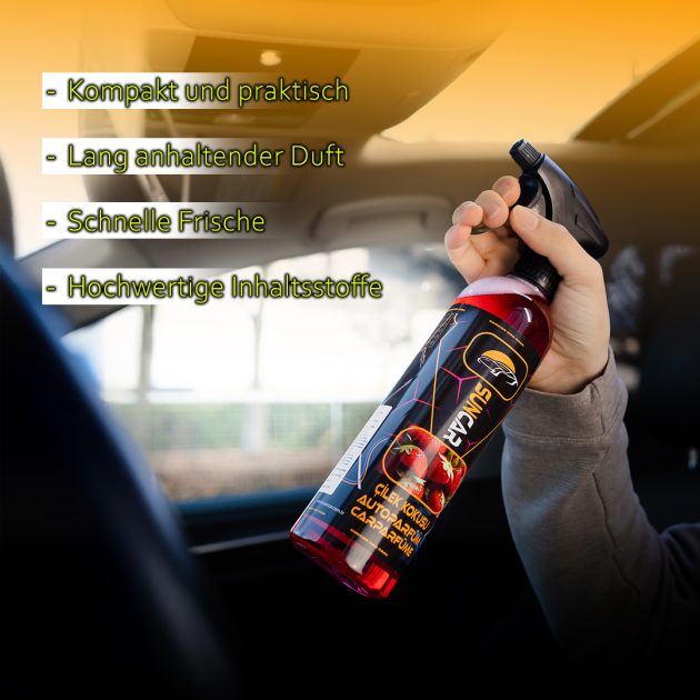 Das SunCar Auto-Parfüm Erdbeerduft – 5 L ist besonders einfach in der Anwendung. Mit wenigen Sprühstößen verteilt sich der Duft gleichmäßig im Innenraum und sorgt sofort für ein frisches Ambiente. Ob auf Teppichen, Fußmatten oder Sitzen – die Anwendung ist flexibel und effektiv.