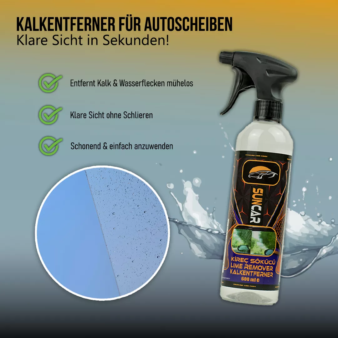 Wasserflecken können besonders hartnäckig sein, da sie oft mineralische Rückstände enthalten, die sich in den Lack oder auf Glasoberflächen einbrennen können. Diese Flecken sind nicht nur schwierig zu entfernen, sondern können auch die Sicht auf der Straße beeinträchtigen und den Glanz des Fahrzeugs mindern. Der SunCar Kalkentferner wurde speziell entwickelt, um diese Rückstände sicher und effizient zu entfernen, ohne den Lack oder andere empfindliche Oberflächen zu beschädigen.