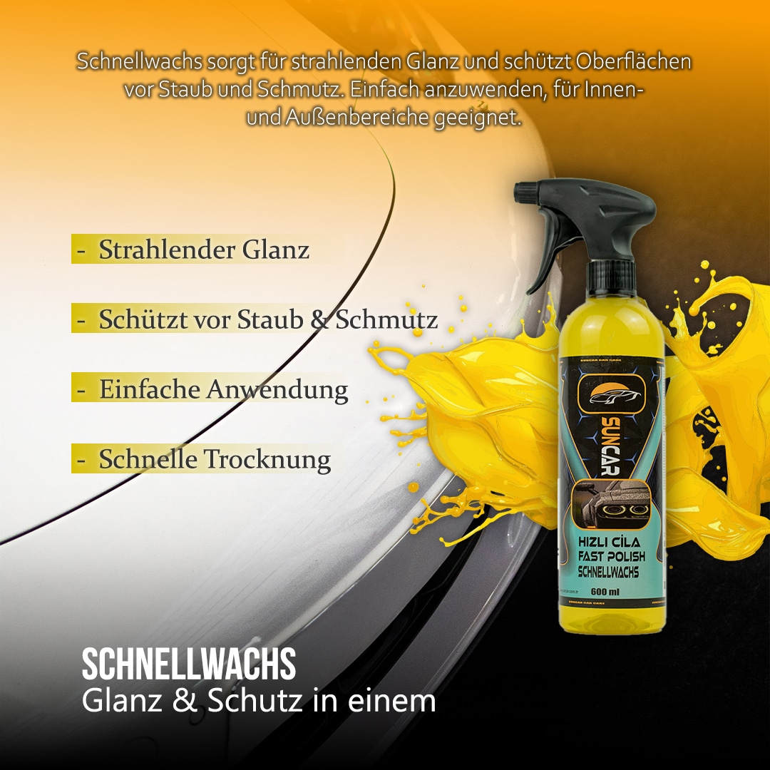 Das SunCar Schnellwachs eignet sich für alle Lackarten und -farben, lässt sich streifenfrei auftragen und ist auch auf Chrom- und Glasteilen anwendbar. So können komplette Fahrzeuge mit nur einem Produkt gepflegt und geschützt werden.